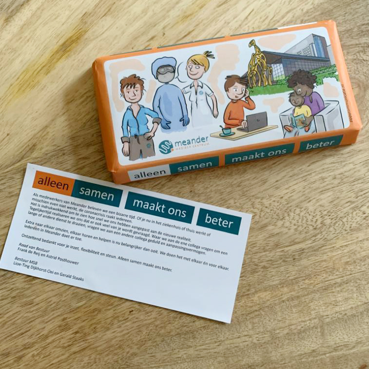 In opdracht van het Meander Medisch Cetrum maakte Zippy een illustratie, een Tony's Chocolonely wikkel en kaart. Alle 3600 werknemers kregen deze reep en kaart en werden zo bedankt voor hun inzet, flexibiliteit en steun tijdens de coronacrisis.
